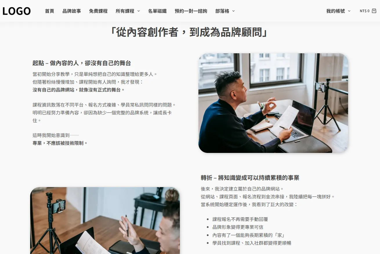 我知道,從零開始架好一個網站、串接平台有多困難所以我把常見問題整理成一套專為品牌講師設計的課程系統組合包讓你可以不必懂程式、不用煩流程,就能開始打造自己的個人品牌