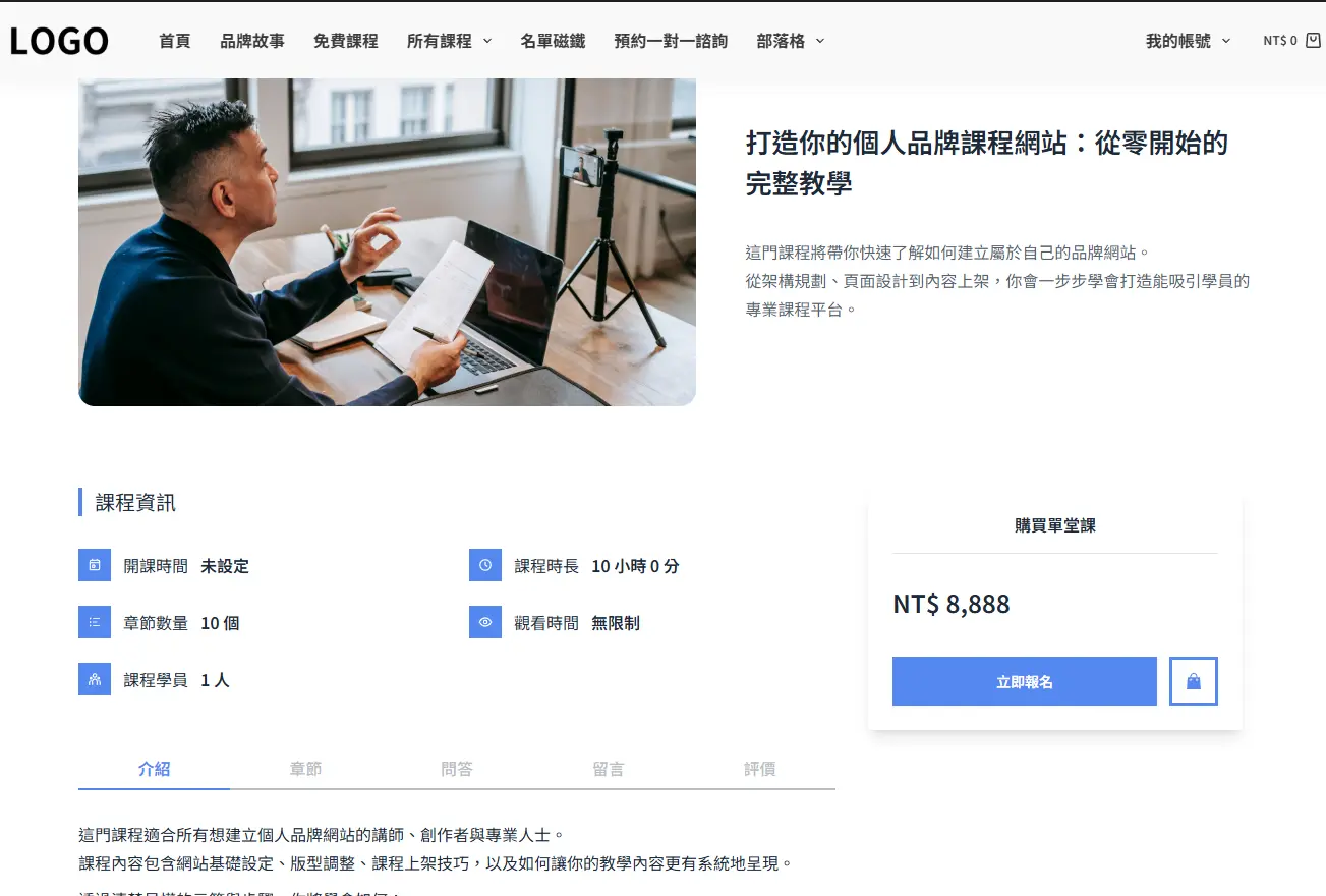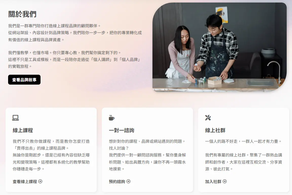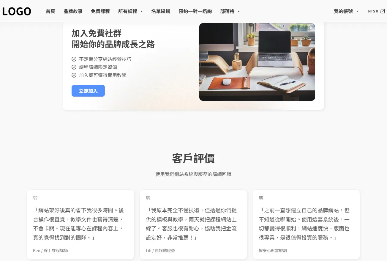 一站式品牌網站建構方案高效能主機+高品質課程系統+專業設計品牌模板全面解決網站建置、內容管理與視覺設計的難題幫助你快速啟動、有效經營自己的課程品牌